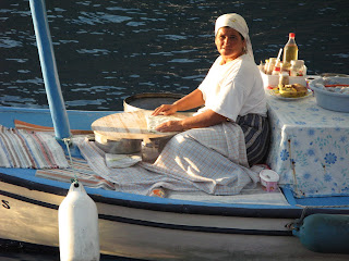 Ormeggiati in soli 2 metri d’acqua, nella grande baia di Kale-Ukagiz, vicino all’isola di Kekova, soffriamo il caldo torrido d’agosto senza un filo d’aria nè per navigare nè per rinfrescare questo tardo pomeriggio. Sembra una giornata milanese avvolta nell’afa dove l’immagine del sole è alonato dall’umidità. L’unico refrigerio è una sorgente d’acqua dolce che sgorga dalle rocce a pochi centimetri dalla superficie del mare. Da qui esce un ruscello d’acqua gelida. Si dice che “un uomo non può considerarsi tale se non resiste sdraiato in quest’acqua almeno 5 minuti”. Ci proviamo, ma resistiamo solo pochi secondi. Non siamo abbastanza uomini… forse dovremmo chiamare un finlandese. Per distrarci dalla calura andiamo al villaggio a comprare del pesce per la cena. Visitiamo lo splendido sito archeologico con tombe Licie sparse a pochi passi dal centro del villaggio. Una visita d’obbligo ai negozi di tappeti e poi rientriamo per metterci ai fornelli. Ci cimenteremo in una ricetta turca per 4 persone: cefali con le verdure.